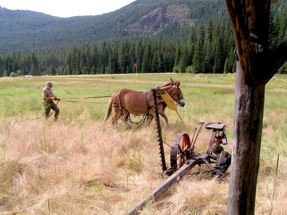 How do you mow the tall spring grass on Red’s Wallowa Horse Ranch airfield in Oregon’s Eagle Cap Wilderness – without the use of motorized equipment? You trail in 20-year-olds Bird and Bat, who team up for the kind of job they know well. With just the right experience, these two mules – with Jim and Holly Akenson…