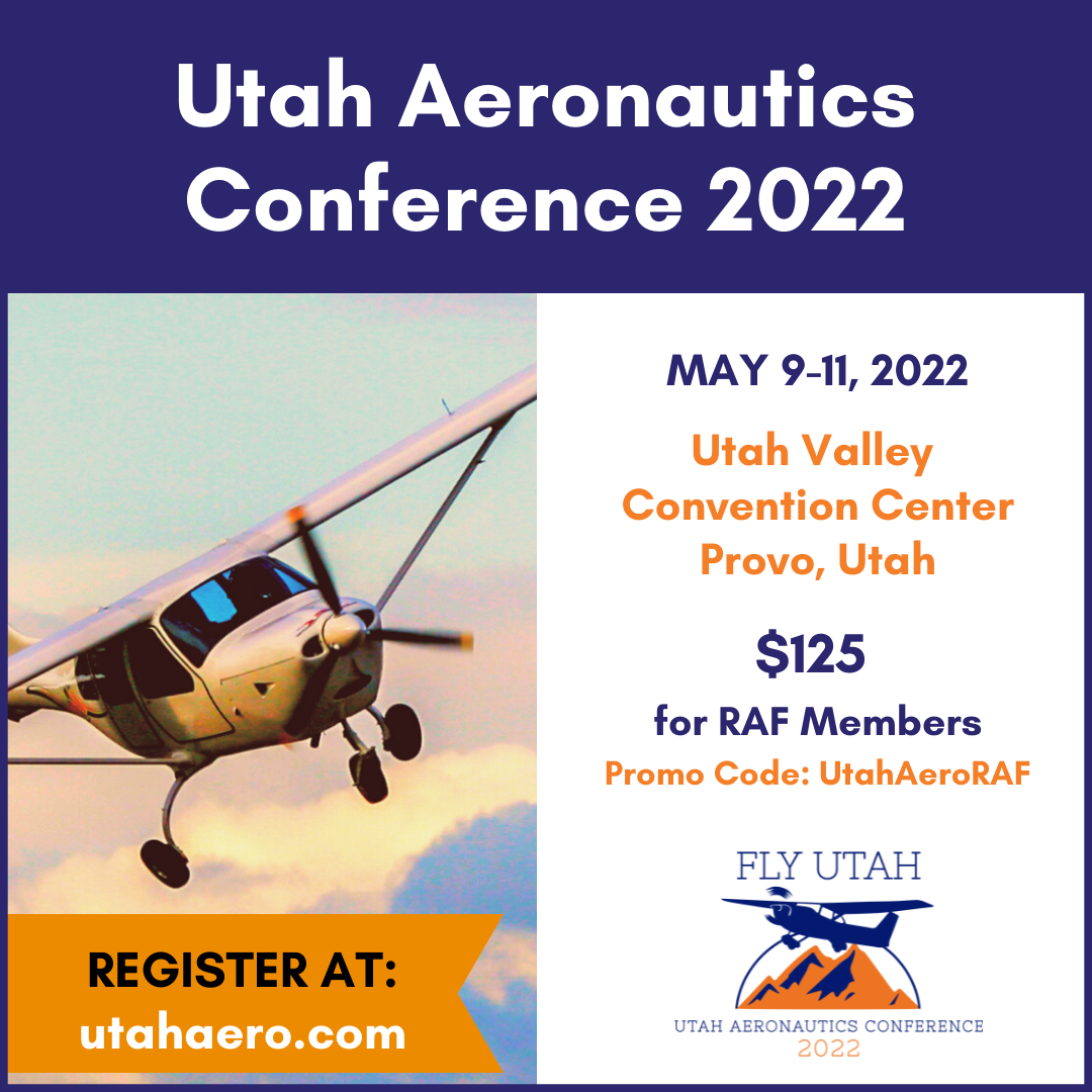 RAF Utah Liaison Wendy Lessig received a cordial invitation from Jared Esselman, Utah Director of Aeronautics for RAF supporters to take advantage of a $200 discount to attend Utah’s upcoming Aviation Conference May 9 – 11 in Provo. “I want to promote backcountry recreational flying in Utah, so I’m offering RAF members a special discount…