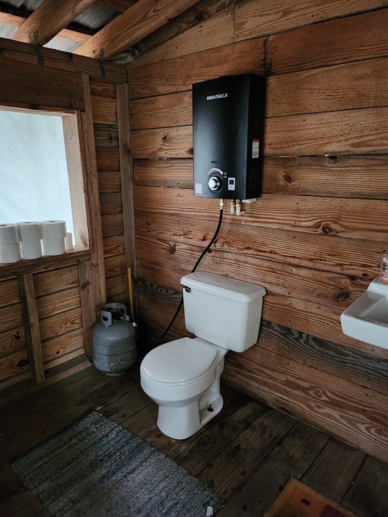 They installed a second new tankless water heater, so both showers have dedicated hot water. Thanks to the water pressure boost pump Eric installed last year, “we finally have good water pressure so both showers can be used at the same time,” he said. With no electricity on the island, he noted that the Honda generator must be running in order for the boost pump to operate, and the shower lights to burn. They also repaired the PVC water supply lines that feed the middle cabin, restoring water service to that location.