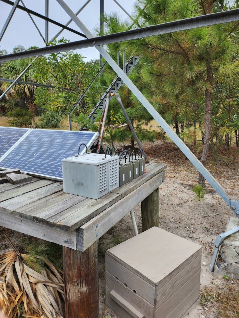 The batteries ensure the system stays online overnight and during extended periods of cloud coverage. Users may have noted some recent intermittence. If the battery voltage drops below a safe level, the runway system shuts down until the solar panels can recharge the batteries the following day. The batteries on the windsock tower need to be replaced due to age, combined with shorter seasonal daylight. Eric plans to replace them in December.