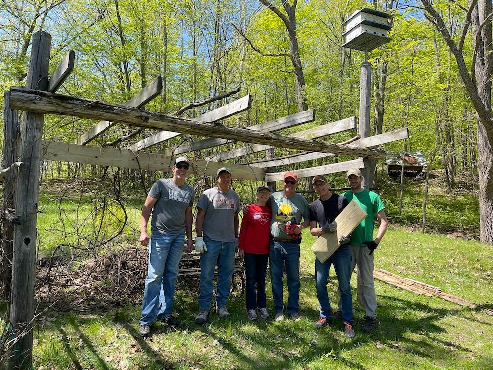 A small group rebuilt four picnic tables with new wood, while some cleaned up broken red and white pine limbs near the camping area, trimmed them and hauled the brush away. Some installed the swim platform and the dock in front of the home. A grape arbor had fallen down over the winter and another group made quick work of that repair.