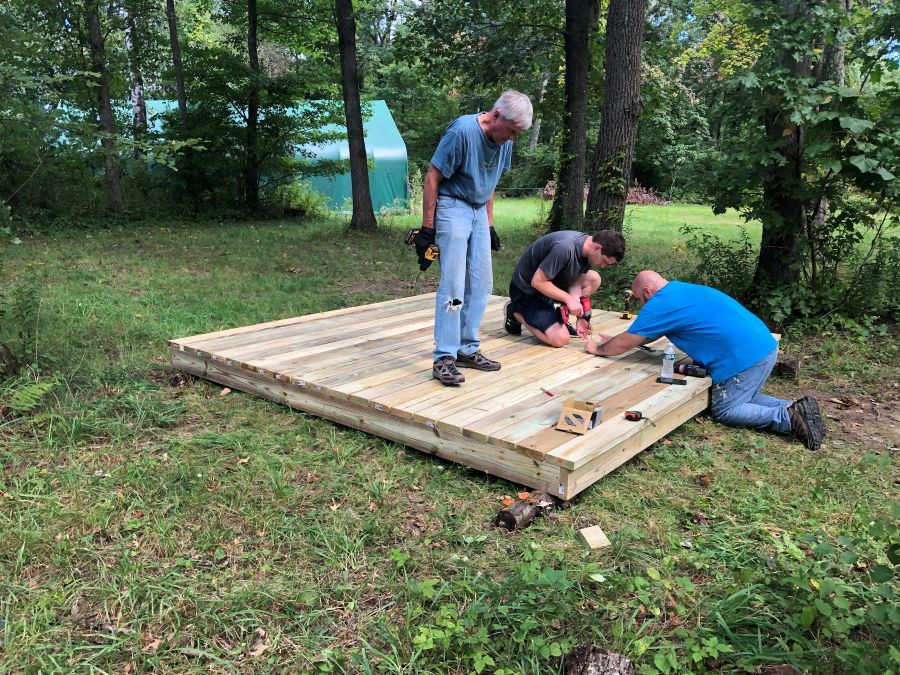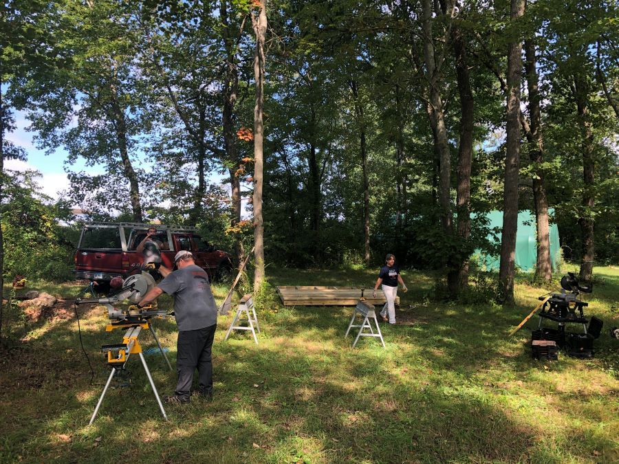 Lyons was joined by RAF Connecticut Ambassadors Greg Delp and DJ Nicholson and four local volunteers. The crew constructed two elevated 10×10-ft tent platforms and placed a fire pit between them, and stacked firewood. Lyons grilled lunch for the work crew and dinner for those who stayed late to help.