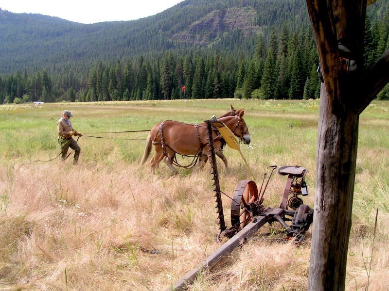 Mayes also recently reported, “I have some good news.” He went on to describe developments resulting from an April 26 meeting with the US Forest Service. Red’s Wallowa Horse Ranch airstrip lies on Forest Service administered lands within the Eagle Cap Wilderness Area, where only non-mechanized equipment can be used for maintenance and improvements. The agency has agreed to fund the purchase of a new horse drawn mower and contribute $1,000 toward mowing this year. Additional USFS funds are committed for materials to build an outhouse at the camping area, the purchase of a web camera, and invasive weed eradication.