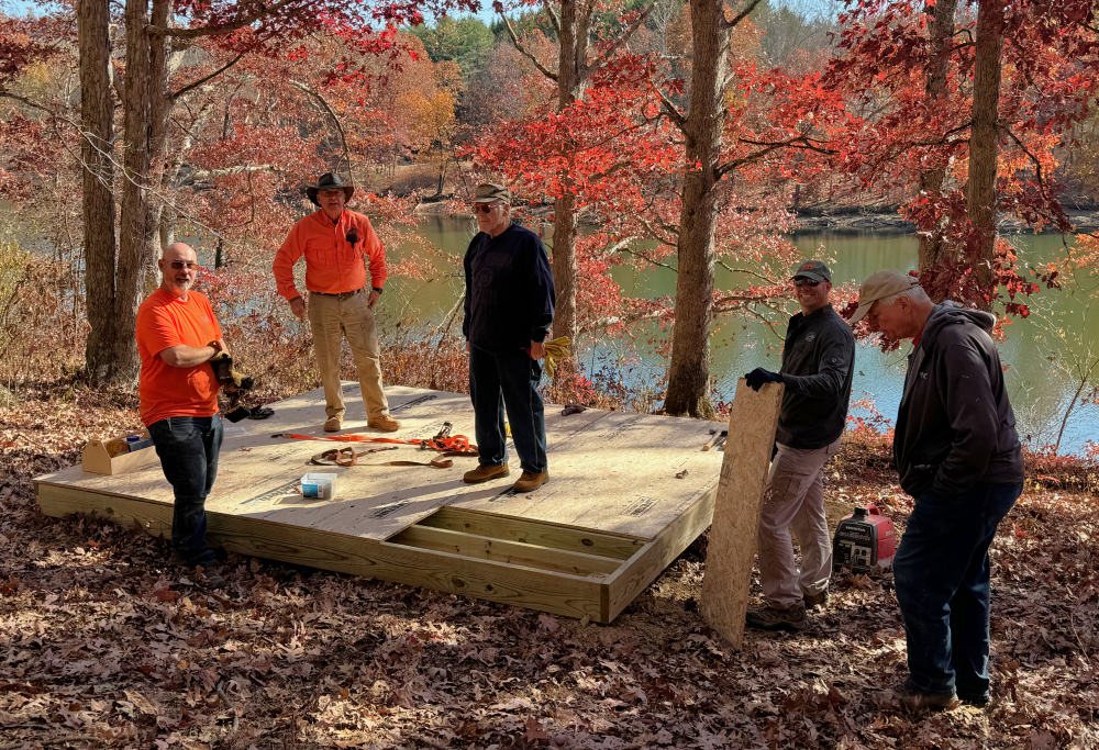 With the support of Airport Manager Ed Crock, lumber for the tent platforms was delivered to the campground and the post holes were augered. Volunteers built two more tent platforms overlooking the lake, each with a picnic table and fire ring. Mortine reports that now visitors can enjoy camping in these pristine spots. She provided hotdogs and hamburgers for lunch, cooked over the newly placed RAF fire ring.