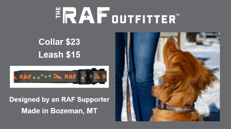 Your dog needs more RAF gear and we have just the thing! These new matching RAF dog collars and leashes are made by Mtn Straps in Bozeman, Montana. The collar comes in two sizes and the leash is 6 feet long.