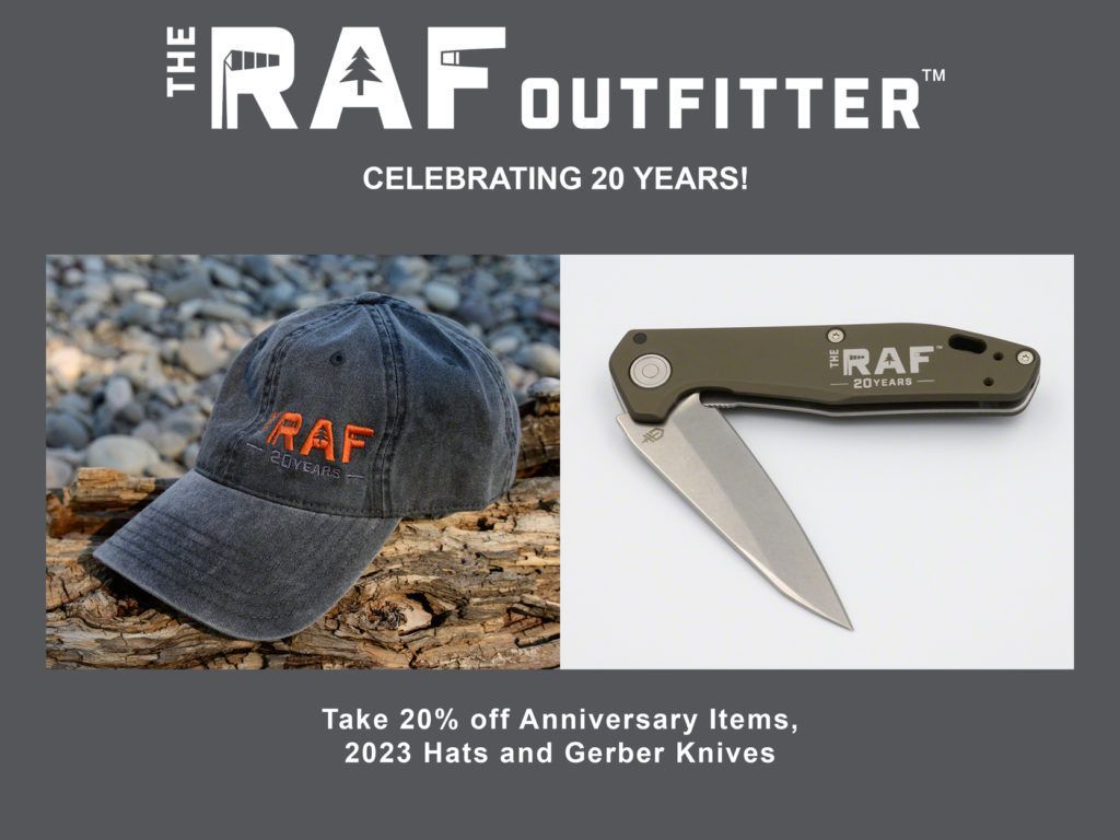 To celebrate 20 years of the RAF, we’re taking 20% off our Anniversary products on the RAF Outfitter for the month of June! Our stylish 2023 hat features the anniversary logo and the year 2023 embroidered on the side. Our handsome Gerber knives have the anniversary logo etched on the aircraft-grade aluminum handle. These items are limited edition, so once they’re gone, they’re gone. Get yours today!