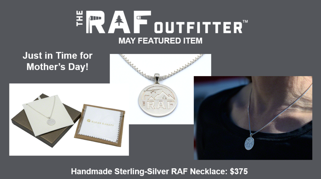 Mother’s Day is coming up and we have just the item to help you celebrate the mothers in your life. We recently received a special shipment of RAF necklaces. These custom-made RAF necklaces were created by Jeff Johnson, an RAF Supporter who specializes in making fine jewelry. They are handcrafted sterling silver on an 18″ sterling-silver chain. They are engravable on the back, and are an elegant way to show your support for recreational aviation. You can view Jeff’s website here.
