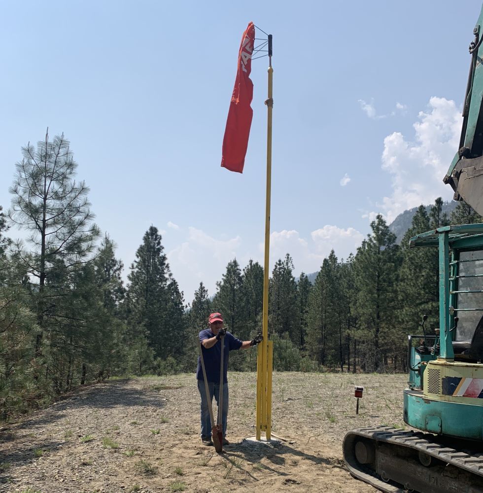 Each spring, Whitelaw organizes volunteers to trim the airstrip and camping area. On a recent weekend, four RAF volunteers and an excavator operator contributed two-and-a-half days of work. A new hole was dug for the outhouse vault, which was then set. The group then reset the outhouse building onto the new vault. They also set the new windsock pole and raised the windsock. R-2 Excavation hauled in 5 loads of gravel and spread it in the main parking area near the picnic tables to stabilize the soft sandy parking area. Additionally, the group added two more fire pits and one more picnic table to increase camping sites.