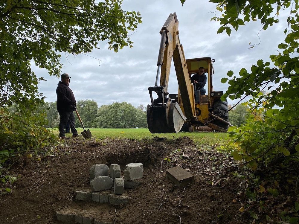 The airport provided an excavator at no charge so the volunteers could remove a stump. “We did some general clean up, trimmed brush, cleared poison ivy from the firewood stacks and fire ring areas,” Lyons said. “We cut in a new path from the tent platforms up to the flight line, and cut in stairs.” They replaced an old stone-lined fire ring with retaining wall blocks.